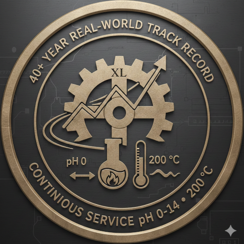 Systems still performing after decades in pH 0–14 and 200 °C continuous service.