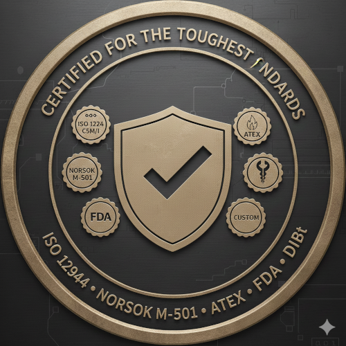 ISO 12944 C5M/I, NORSOK M-501, ATEX, FDA, DIBt, and custom client specifications.
